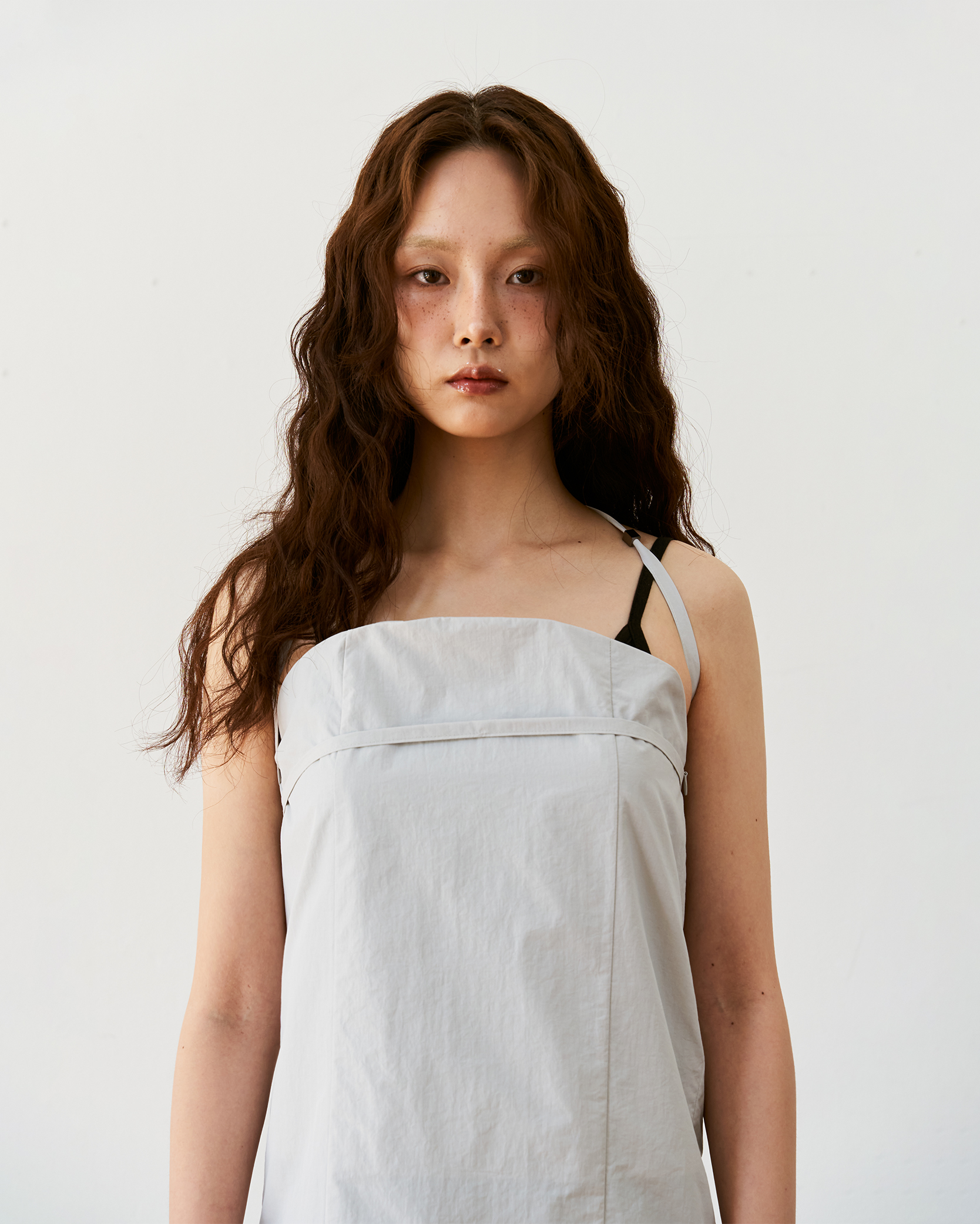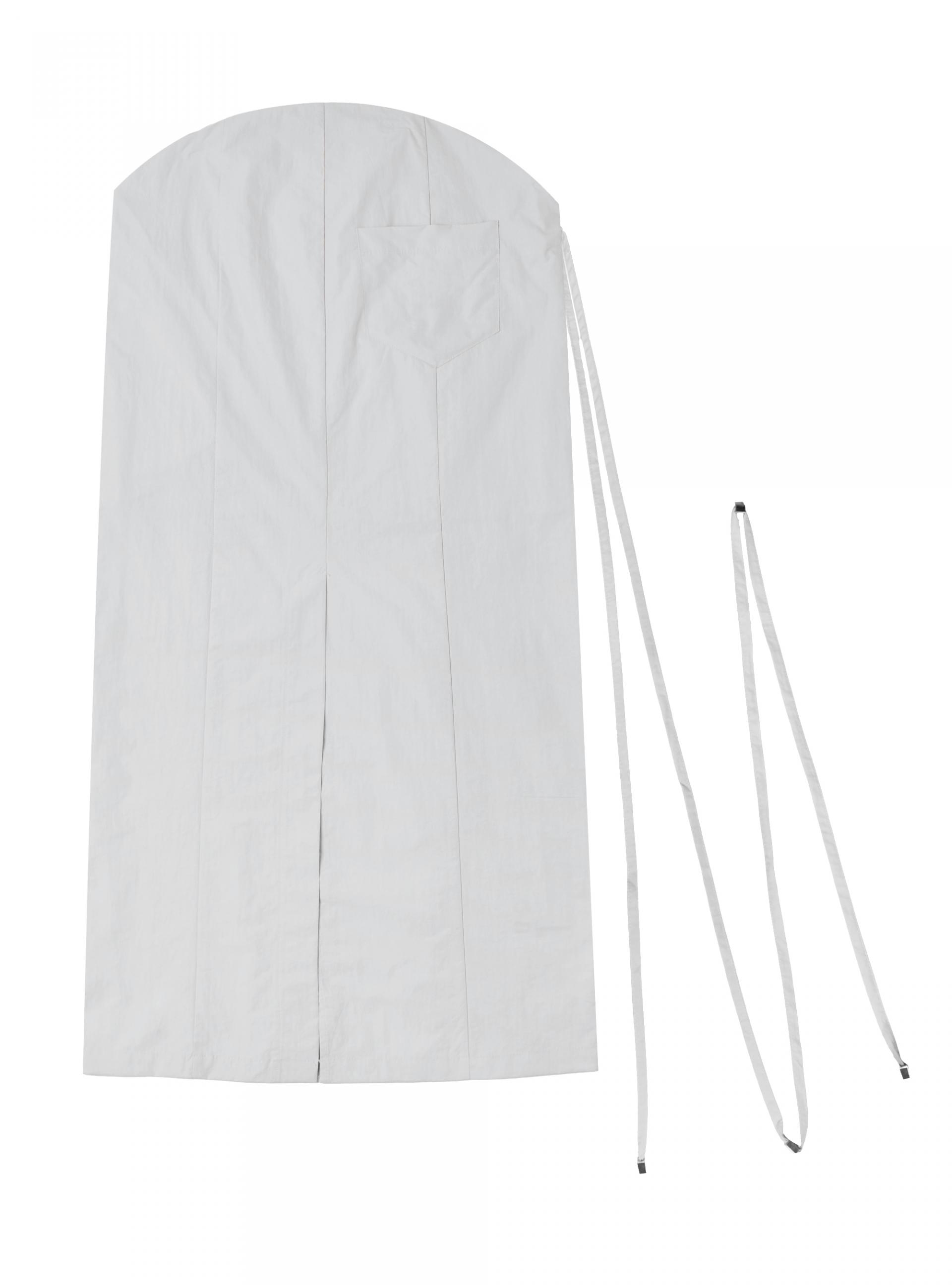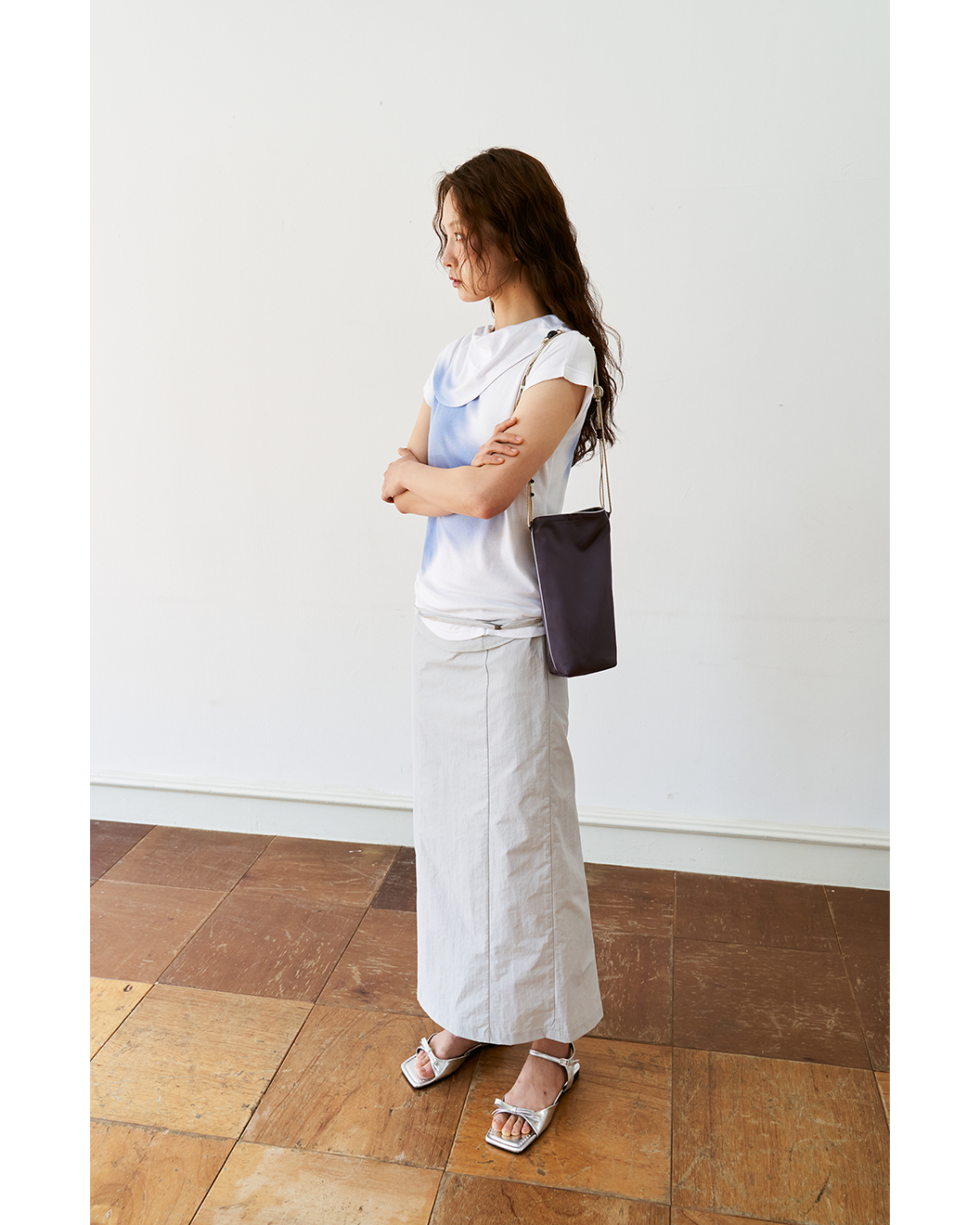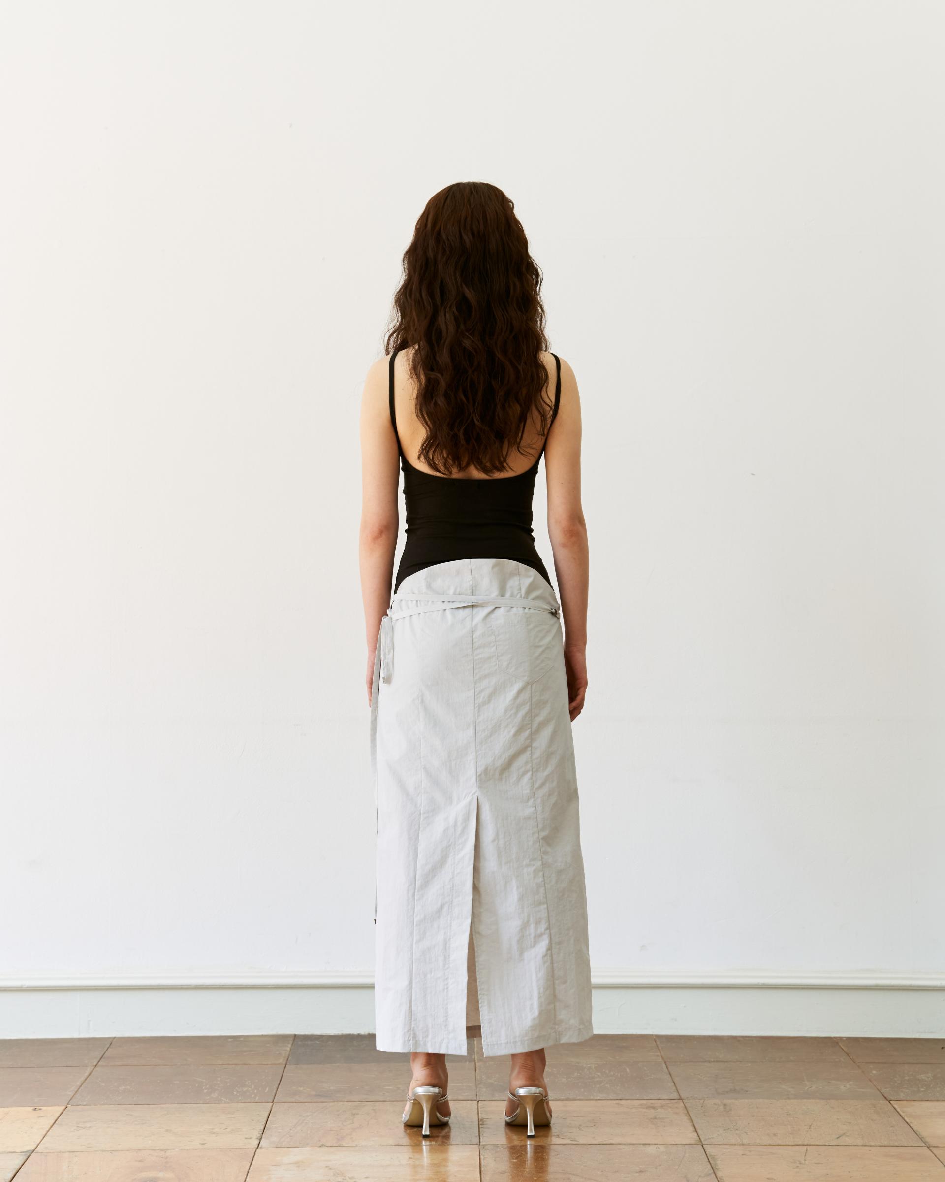 90cm의 롱한 기장의 맥시 스커트 입니다. 몸 전체를 지나는 절개 라인으로 허리와 엉덩이 라인을 잡아주고 발목까지 일자로 떨어지도록 디자인 되었습니다. 힙을 덮는 안단으로 비침을 잡아주며 골반에서 시작되는 로우 웨이스트로 제작되었습니다. 길이가 다른 두 개의 스트링을 활용해 리본을 묶어 롱스커트로 연출 할 수 있으며 목 뒤로 둘러 원피스 형태로 활용할 수 있는 두가지 스타일링이 가능합니다.