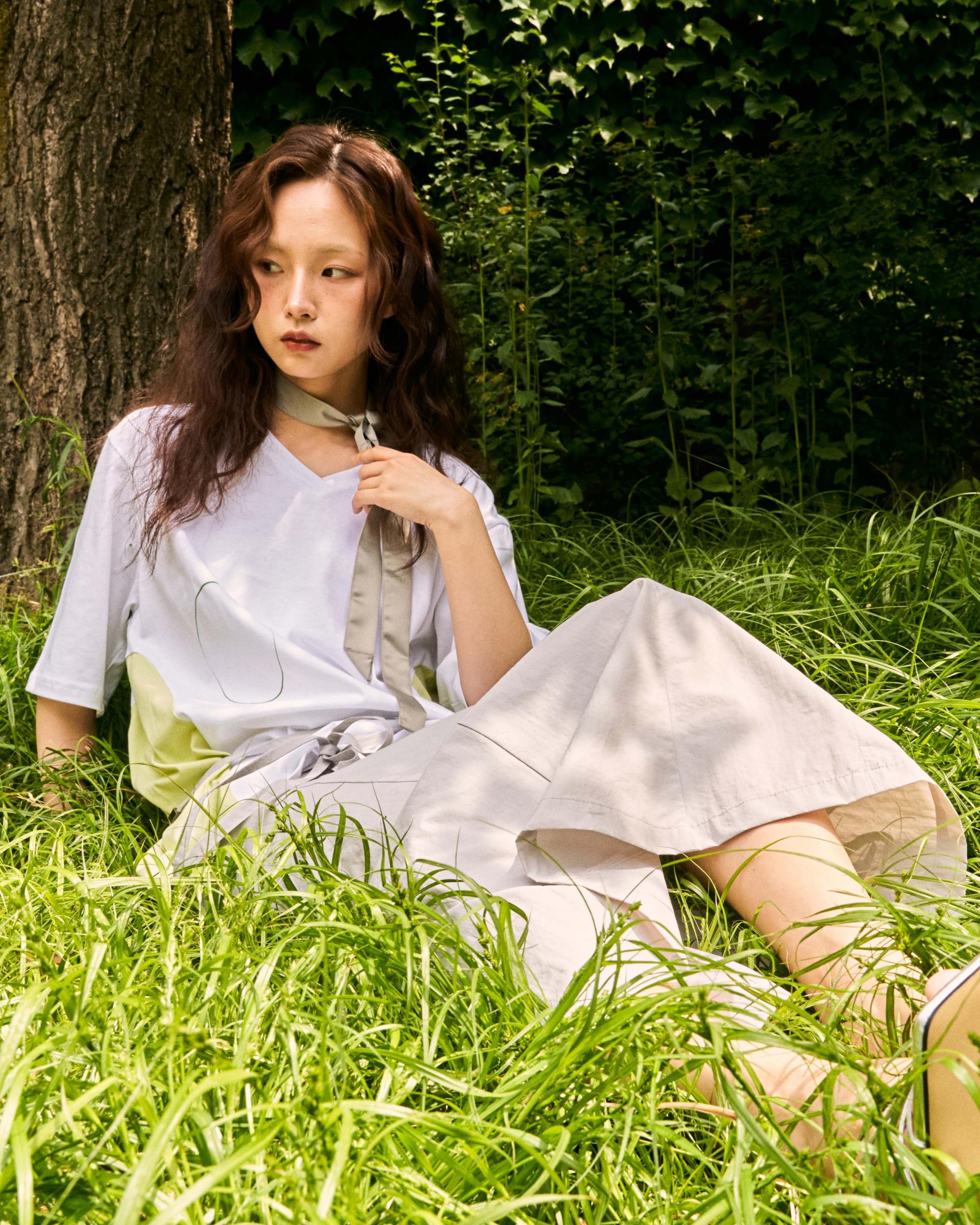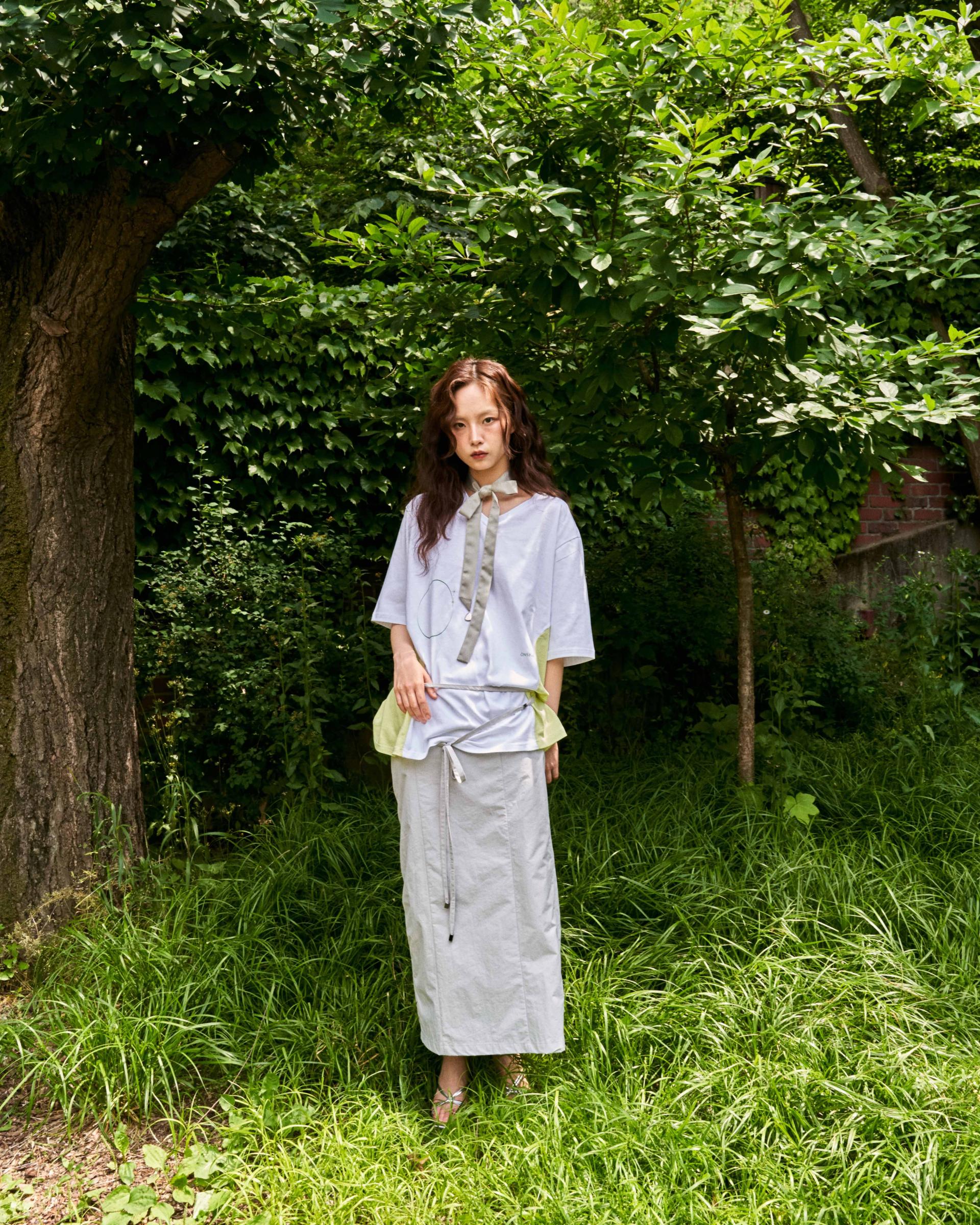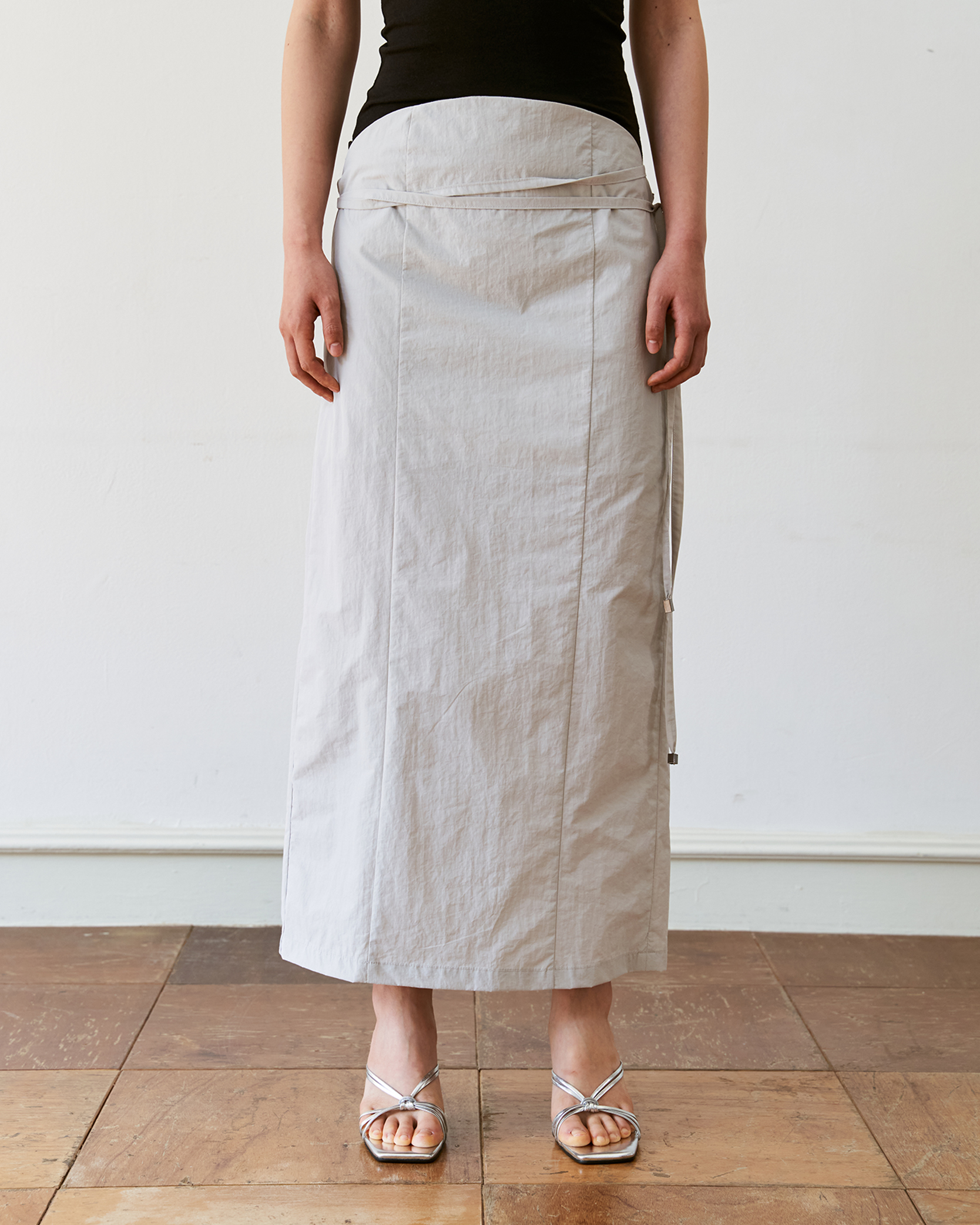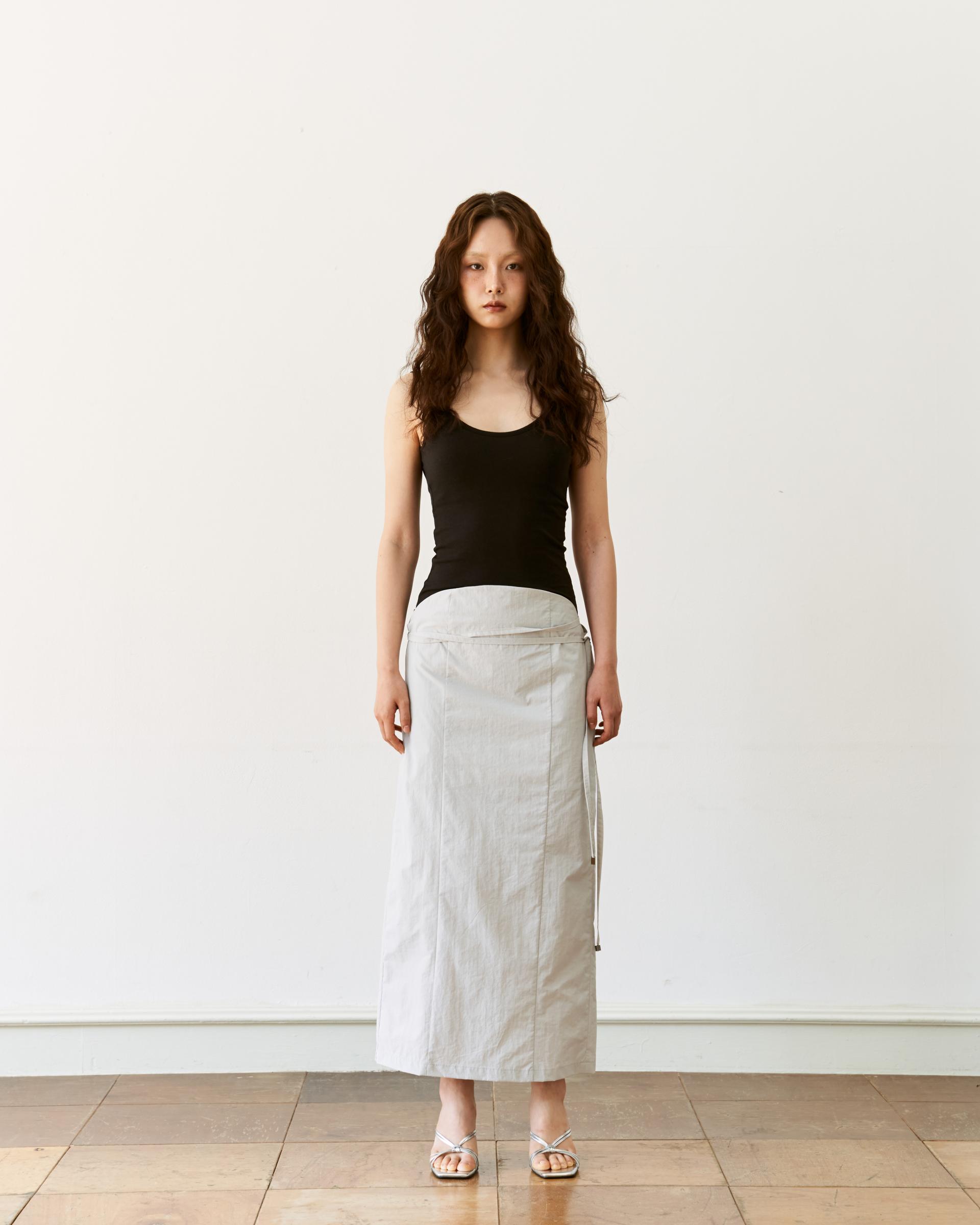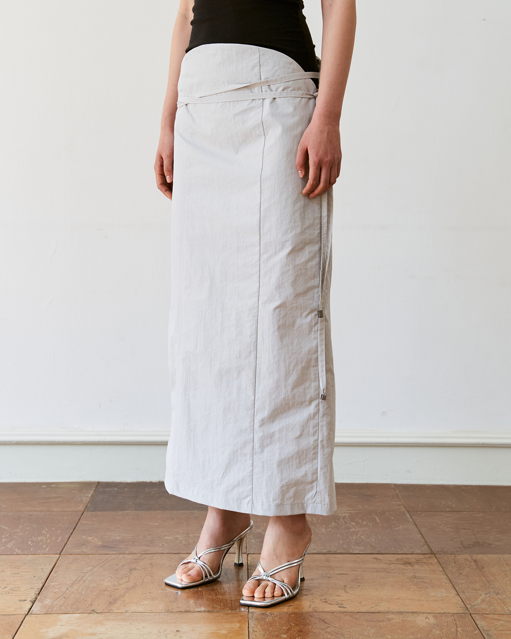 둥근 라인 디테일과 긴 끈을 통해 다양한 스타일링이 가능한 라운드 스트링 롱 스커트