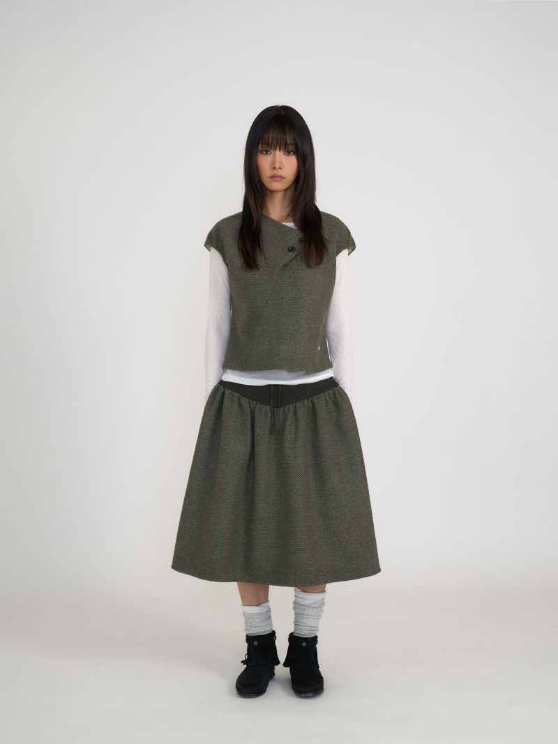 단추를 모두 채우면 자연스럽게 드레이핑되는 하이넥 칼라가 돋보이며, 단추를 풀어 내리면 언밸런스한 큰 칼라가 포멀한 분위기를 연출합니다. 한쪽으로 치우친 여밈 디자인이 세련된 포인트를 더해주며, 프린세스 절개 라인을 넣어 허리선을 자연스럽게 살려줍니다. 너무 타이트하지 않은 핏으로 편안하게 착용할 수 있으며, 소매에는 고무줄을 넣어 볼륨감 있는 퍼프 실루엣을 완성한 아이템입니다.