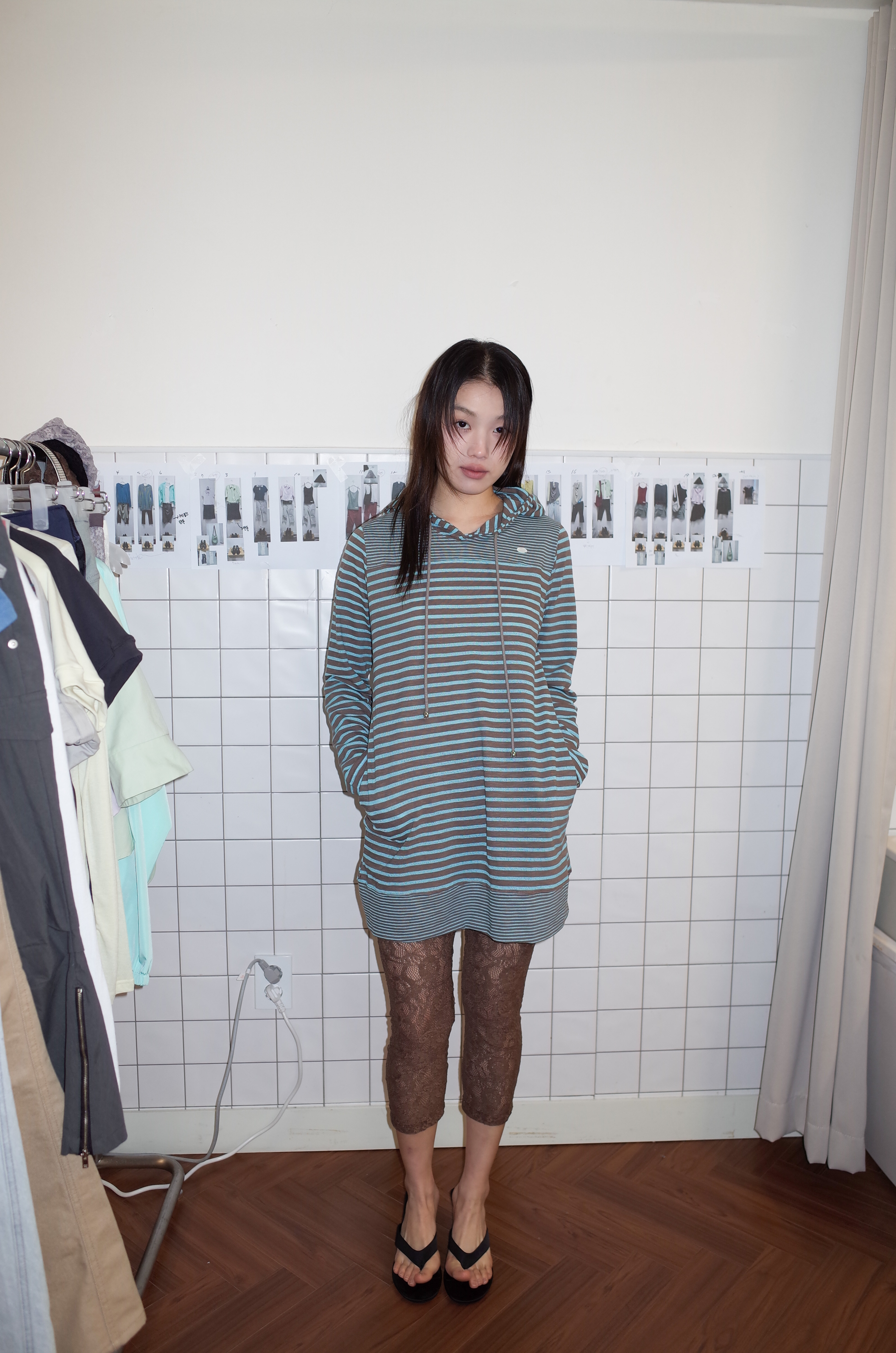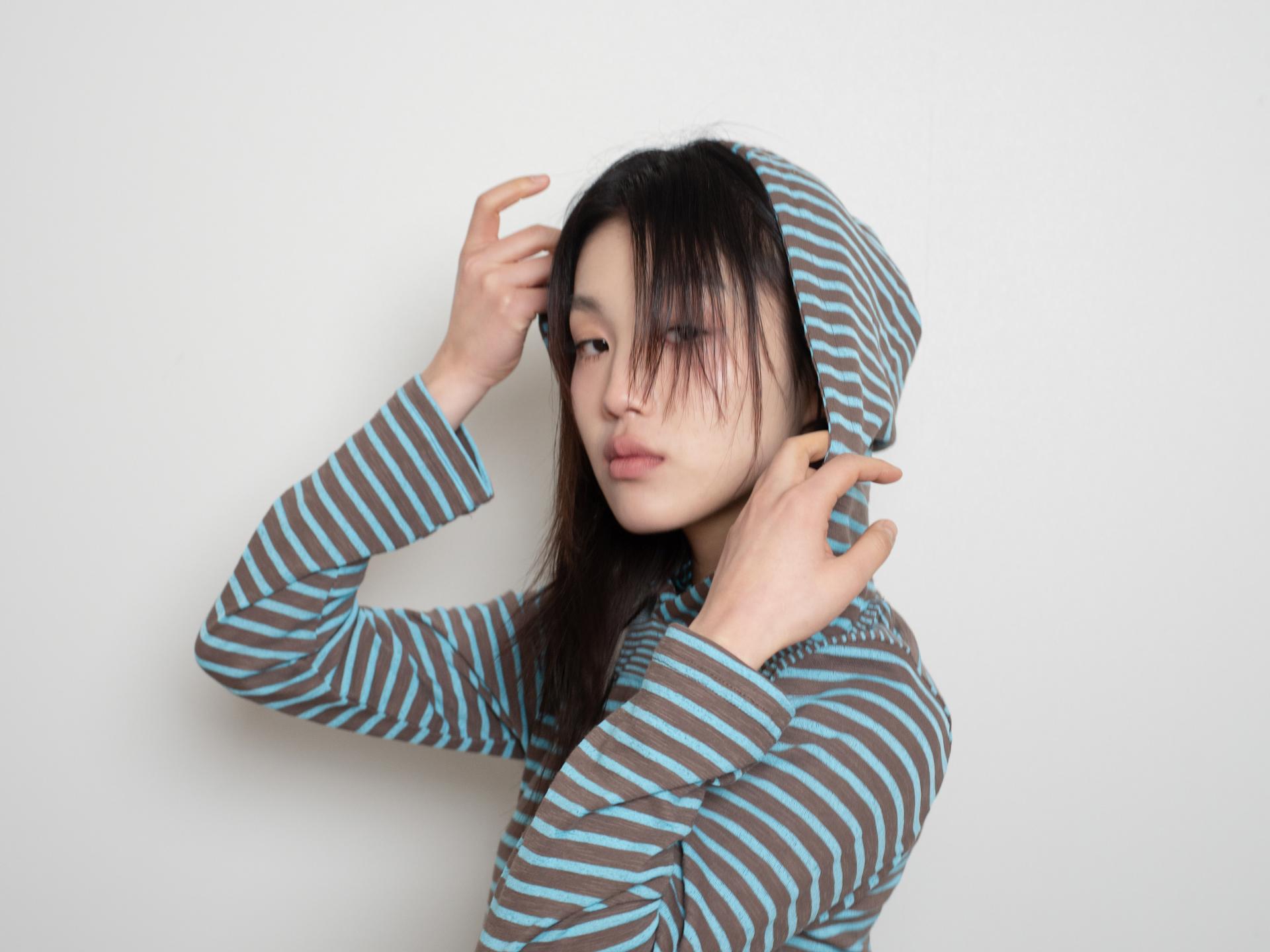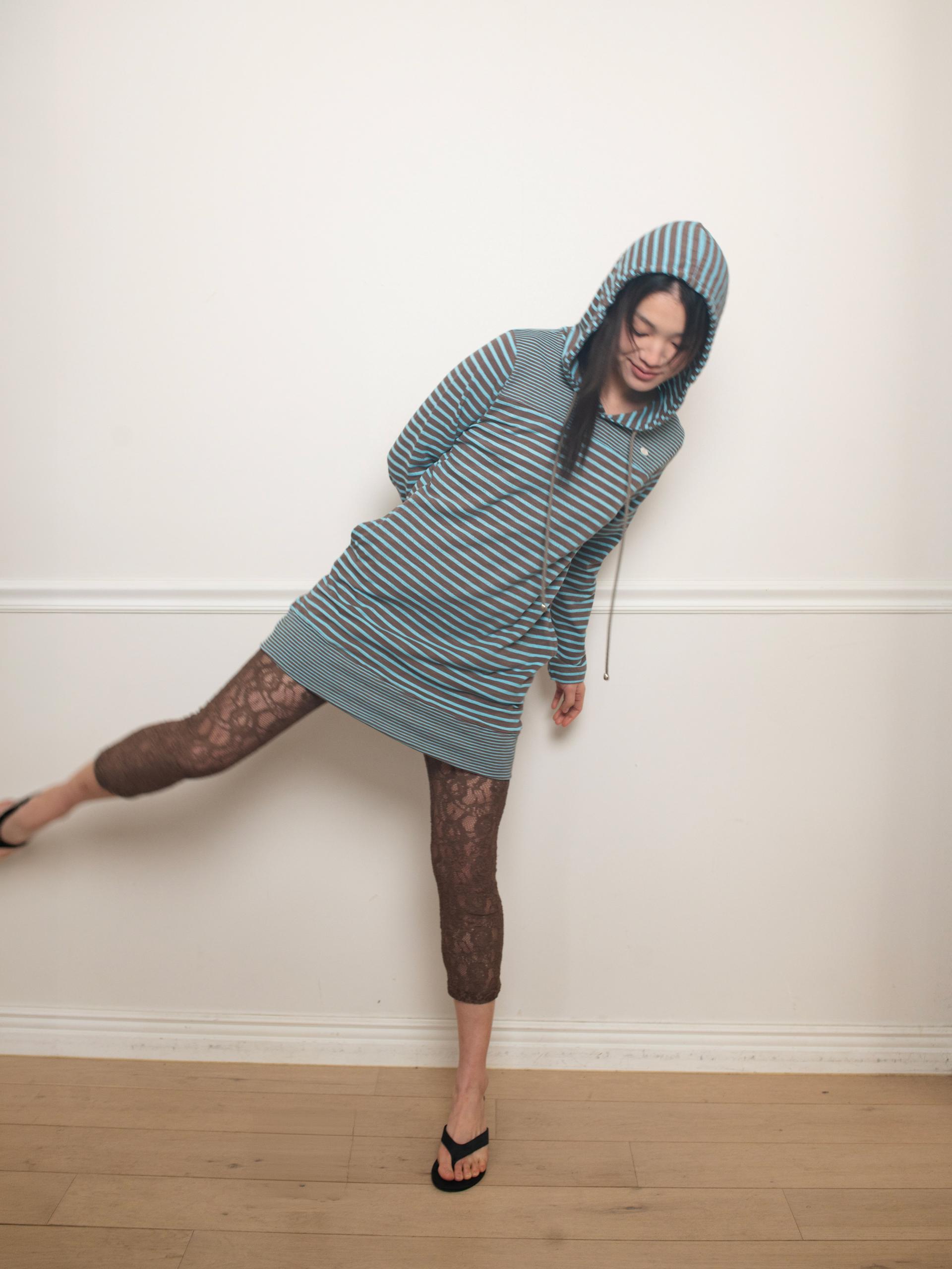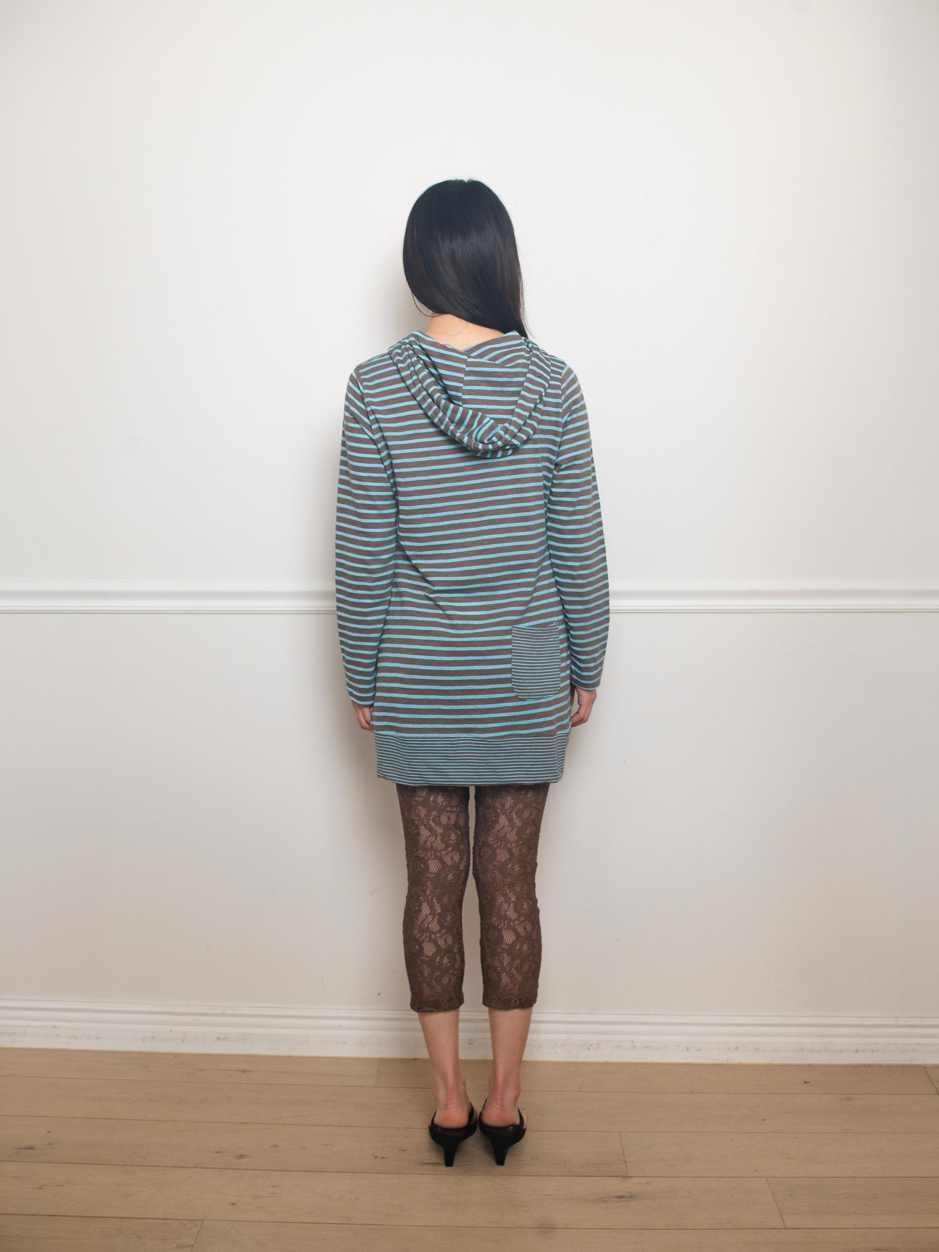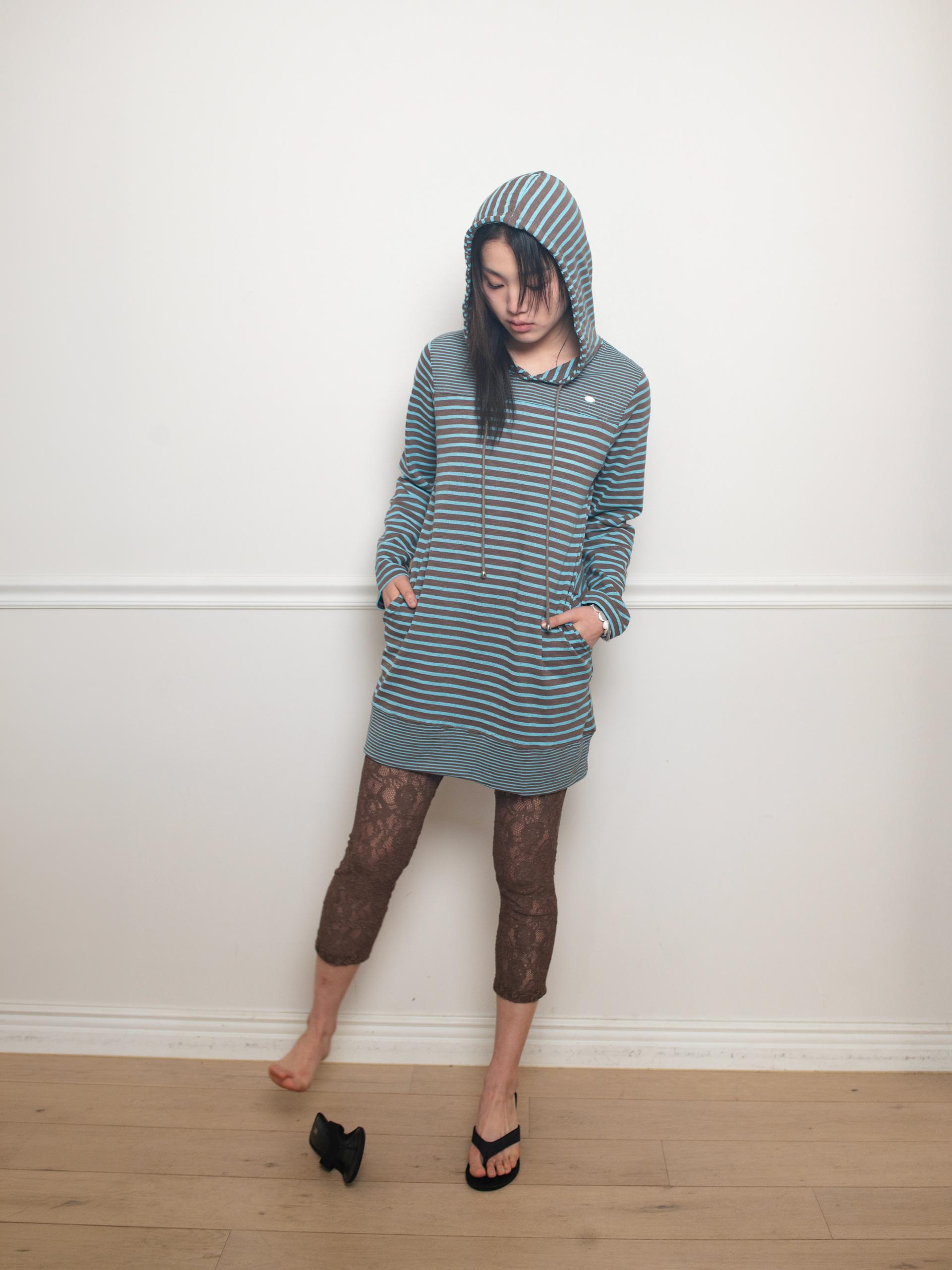 스트라이프 원단으로 제작된 STRIPE HOODIE DRESS