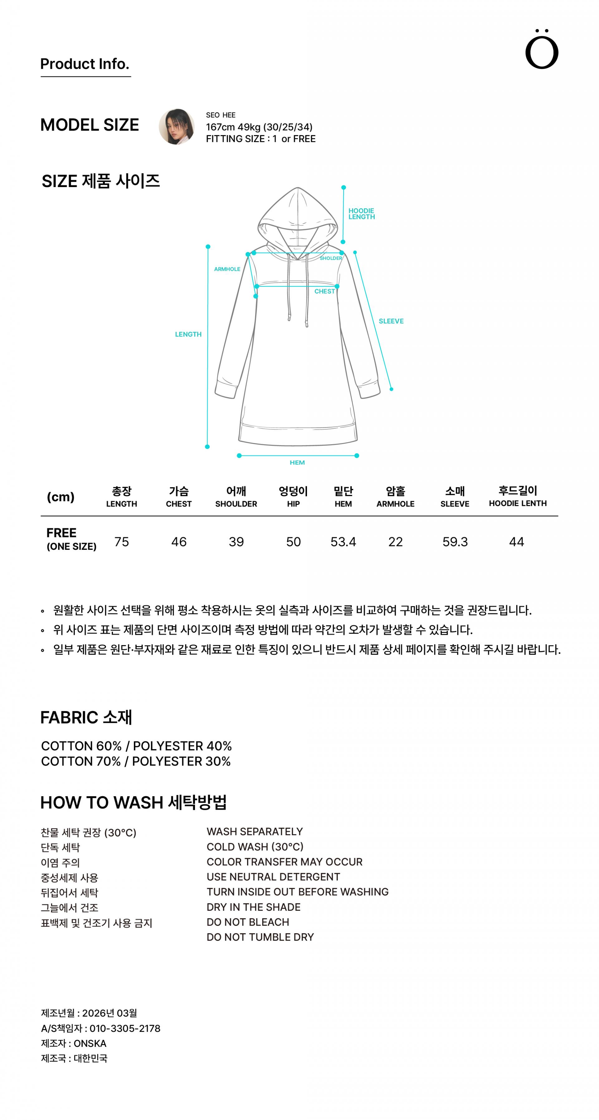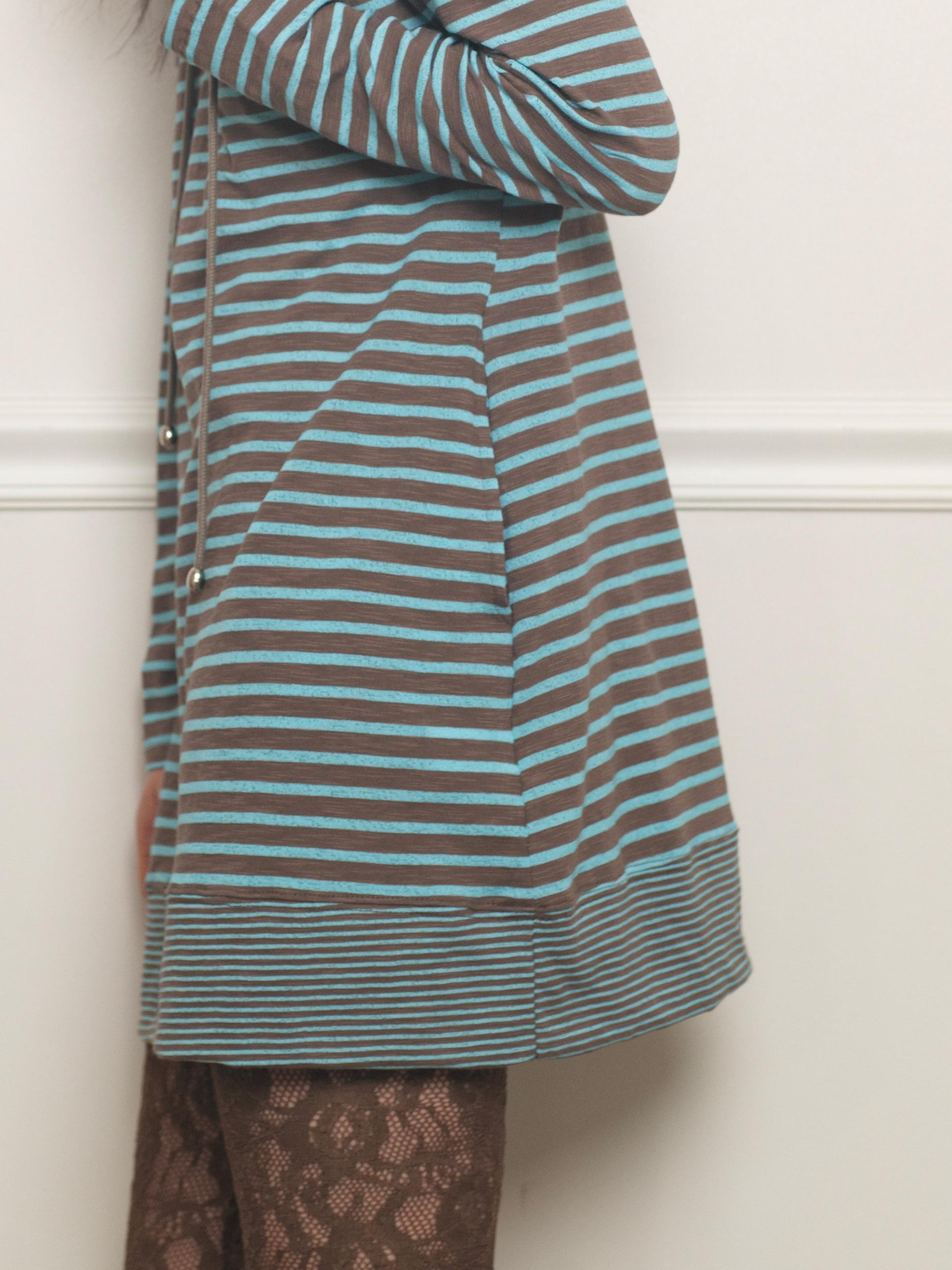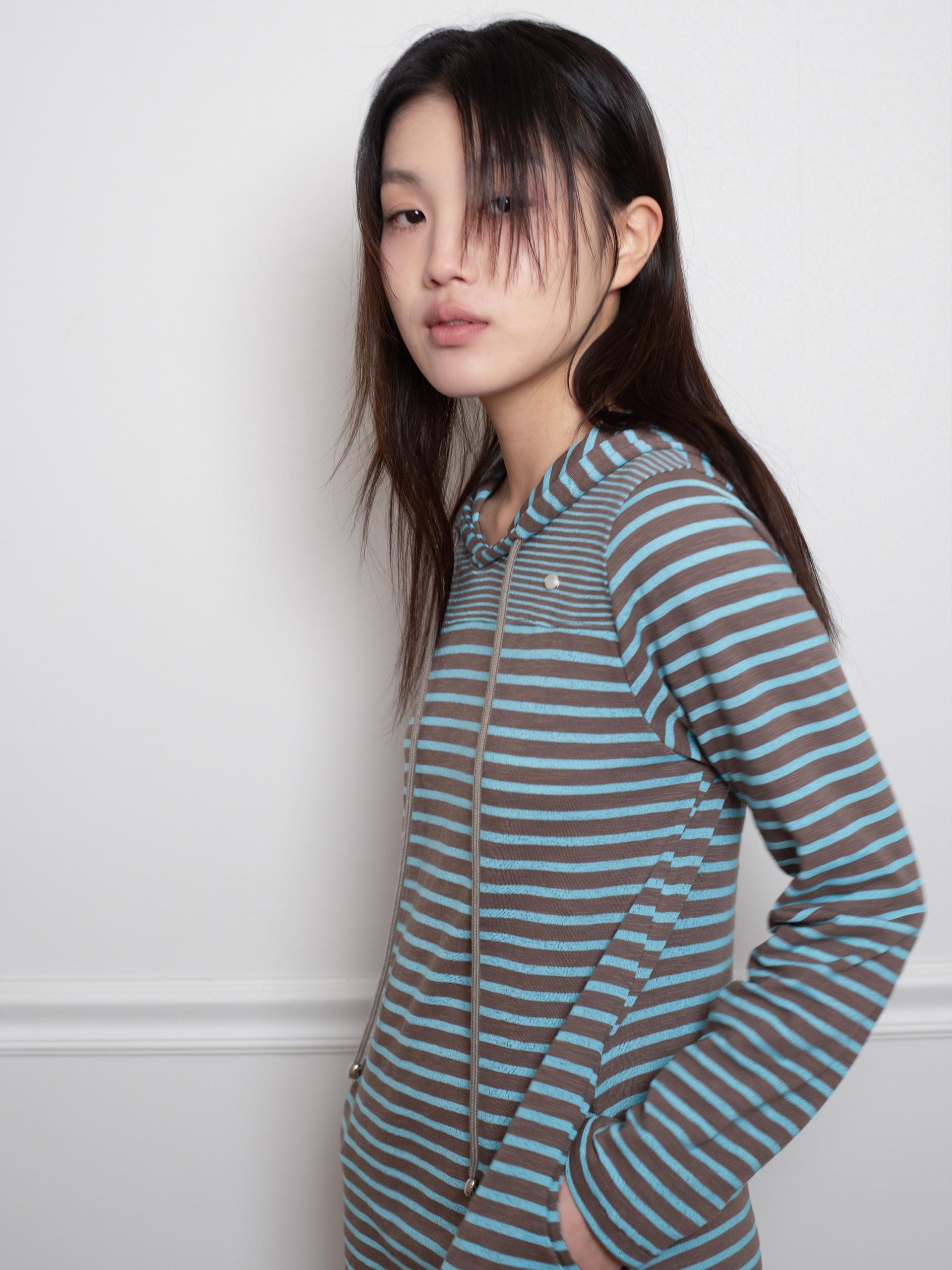 간격이 다른 두 가지 스트라이프 원단을 믹스해 독특한 리듬감을 살린 디자인입니다. 신축성 있는 원단으로 편안하게 제작되었으며, 적당한 미니 기장으로 단독은 물론 팬츠와 레이어드하기에 좋습니다. 빅 후드와 사이드 포켓으로 실용성을 더하고 왼쪽 가슴에는 온스카 로고가 각인된 단추 포인트를 더했습니다.