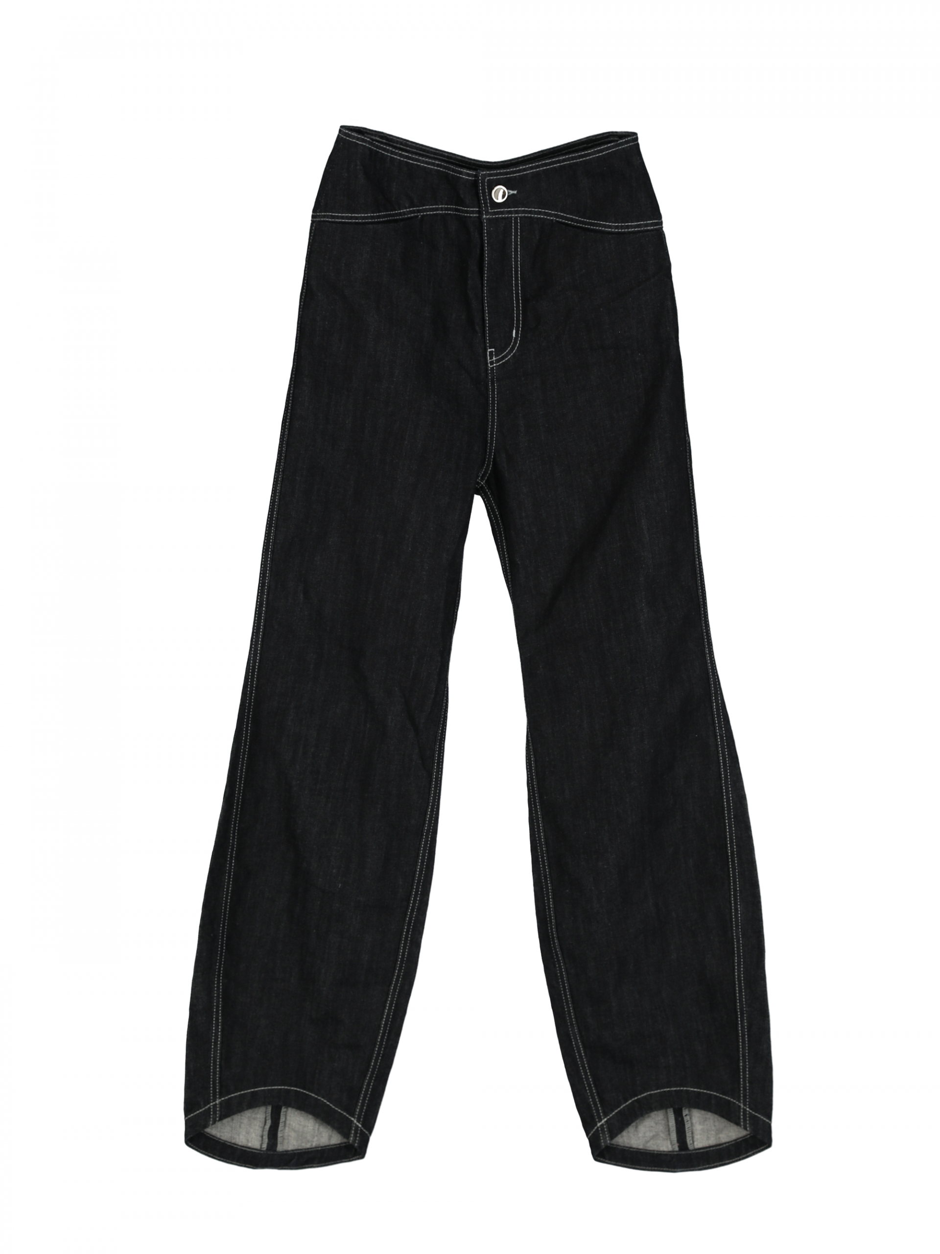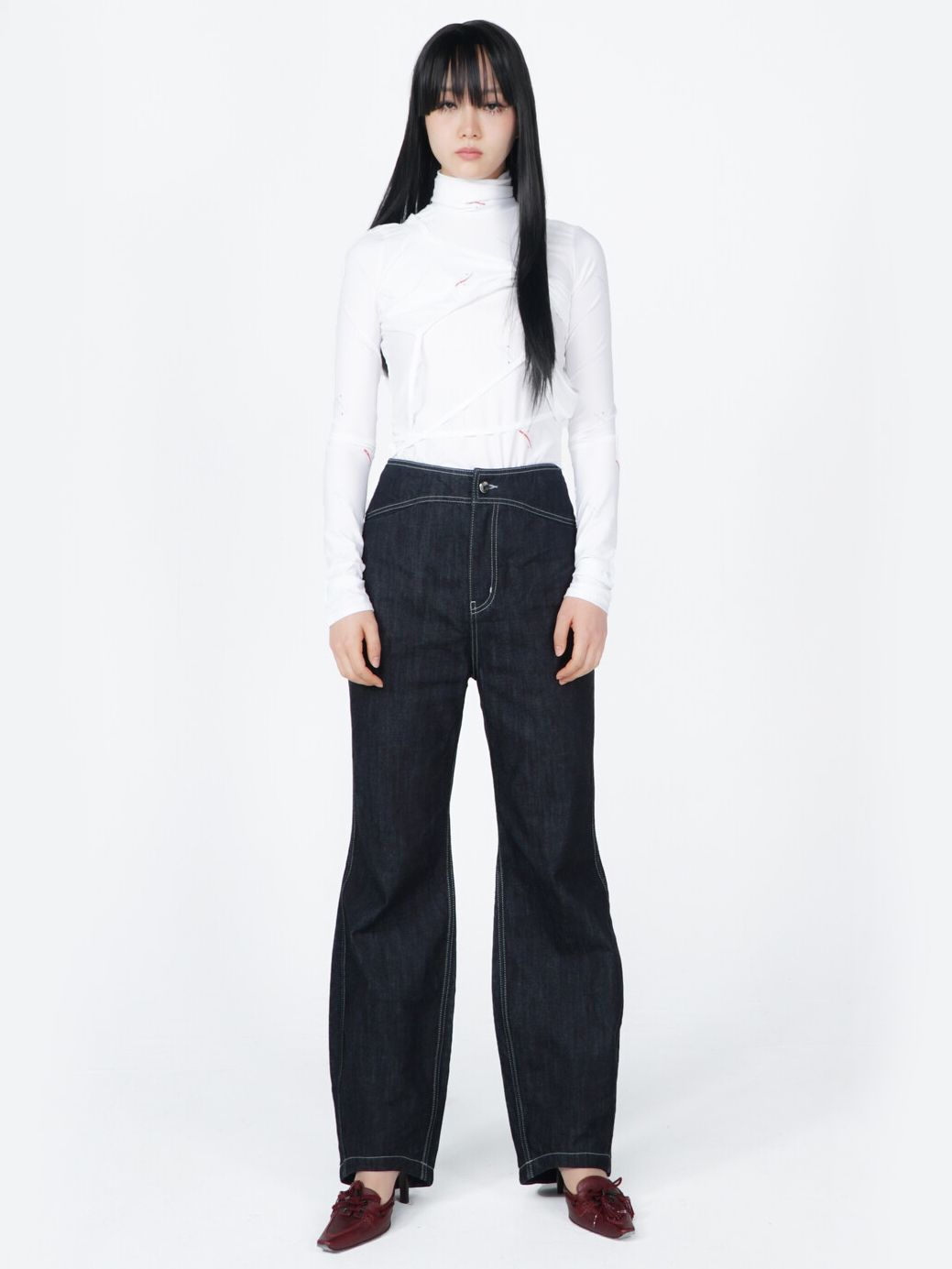 곡선 형태에 주목하여 바지의 시작부터 끝까지 아름다운 곡선을 구현한 curved denim pants